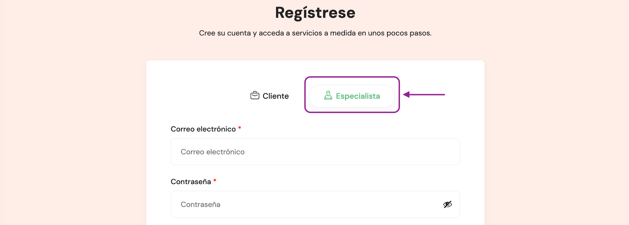 Este paso es muy importante, ya que de esto dependerá el tipo de uso de la cuenta. En tu caso, que quieres crear una cuenta como especialista, necesitas hacer clic en el botón "Especialista".