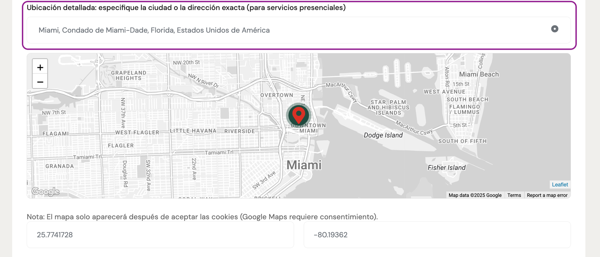 La ubicación detallada te permite especificar la ciudad o la dirección exacta donde realizas sesiones o prestas servicios presenciales. Este campo es útil para que los usuarios puedan encontrarte en mapas y confirmar tu zona de atención en caso de que tu servicio sea presencial.