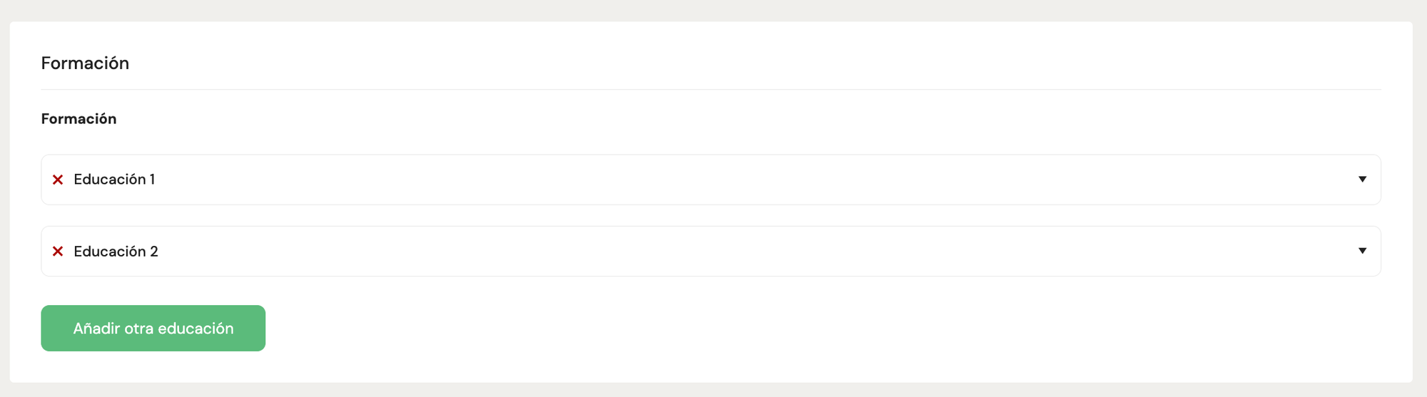 En campos como empleo o experiencia laboral, podrás añadir múltiples registros con información como fecha de inicio, fecha de finalización y cargo o rol desempeñado. Esta información aparecerá organizada en un formato cronológico, mostrando tu trayectoria desde lo más reciente hasta lo más antiguo.